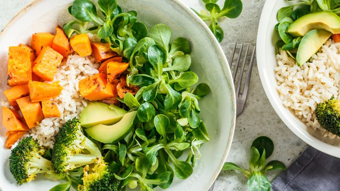 Vegan lunch bowl with brown rice, broccoli, sweet potato, rice and salad. Vegan food concept.